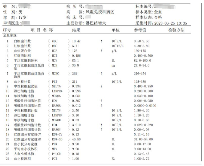 骨髓細(xì)胞學(xué)意見:骨髓增生活躍,嗜酸性粒細(xì)胞增高,可見分類不明細(xì)胞,請(qǐng)結(jié)合臨床,骨髓細(xì)胞學(xué)檢查初步排除淋巴瘤骨髓浸潤(rùn)及血液病可能。患者的嗜酸性粒細(xì)胞升高與全身淋巴結(jié)腫大有必然的聯(lián)系么?當(dāng)患者出院后,查閱了患者的相關(guān)實(shí)驗(yàn)檢查,見圖4: