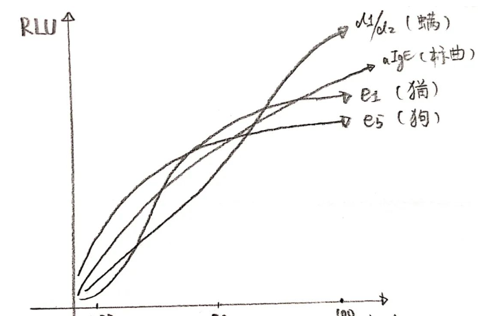 我們來分析一下他這句話的意思,尤其是第二點。由于曲線和各個特異性項目采用的是相同的酶,所以我們可以想象在一個理想狀態(tài)下,如果特異性項目和曲線測出來的熒光值相同,那么就可以證明此時特異性項目抓住的sIgE和曲線抓住的tIgE的量是相同的;但是有一個問題,這兩者各自的“抓取效率”如何呢?