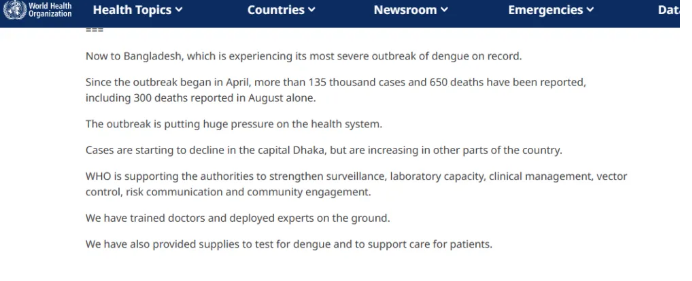 世衛(wèi)組織總干事譚德塞周三在新聞發(fā)布會(huì)上表示,僅上個(gè)月就有超過300人死于登革熱,疫情的爆發(fā)給孟加拉的衛(wèi)生系統(tǒng)帶來了巨大壓力。