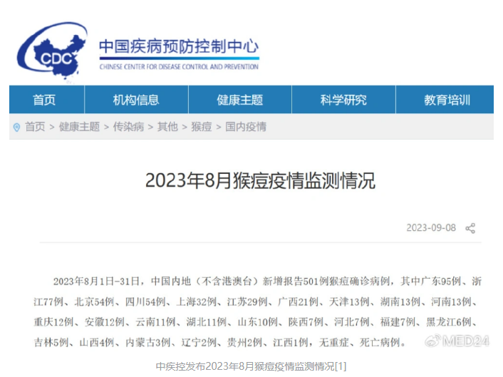 9月8日,中疾控發(fā)布8月猴痘疫情監(jiān)測情況[1]。2023年8月1日-31日,中國內(nèi)地(不含港澳臺(tái))新增報(bào)告501例猴痘確診病例,相較7月增加10例。